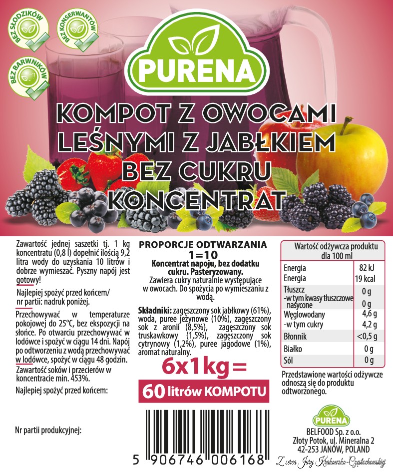 Przedmiotem sprzedaży jest koncentrat kompotu z owocami leśnymi bez cukru Purena 1kg