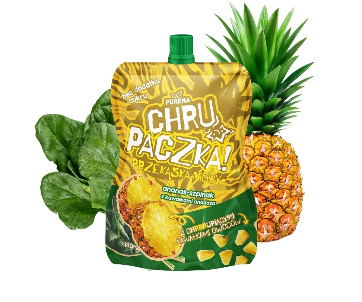 Przedmiotem sprzedaży jest owocowa przekąska mocy od marki Purena o nazwie Chrupaczka przekąska o smaku ananas-szpinak z kawałkami ananasa 180g