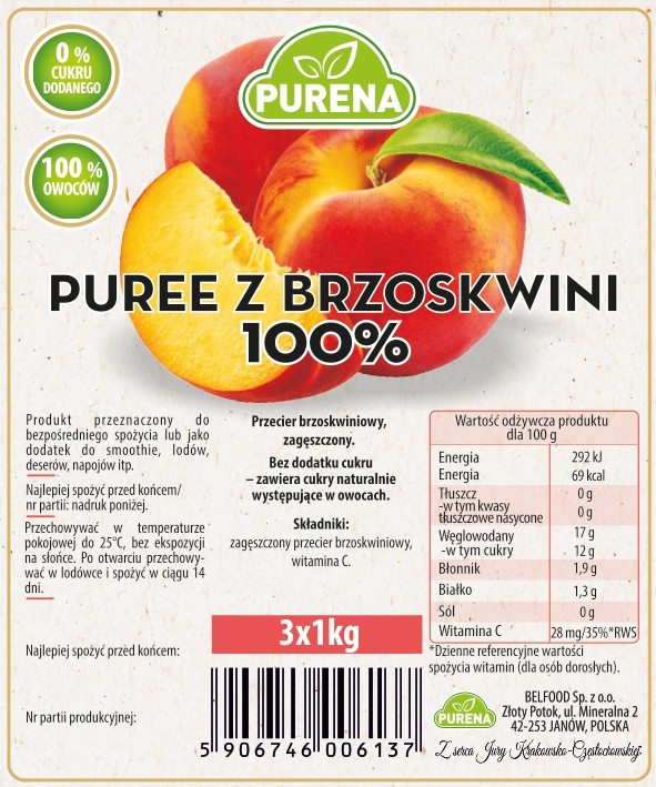 Przedmiotem sprzedaży jest Puree z brzoskwini 100% PURENA 1kg