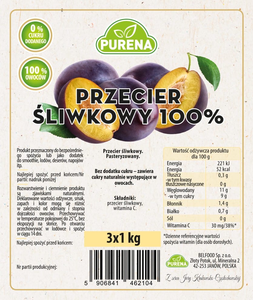 Pulpa puree przecier śliwkowy 100% bez cukru 1 kg zestaw 3 sztuki