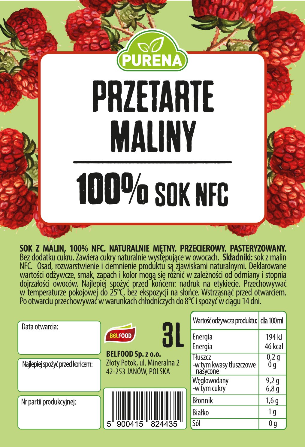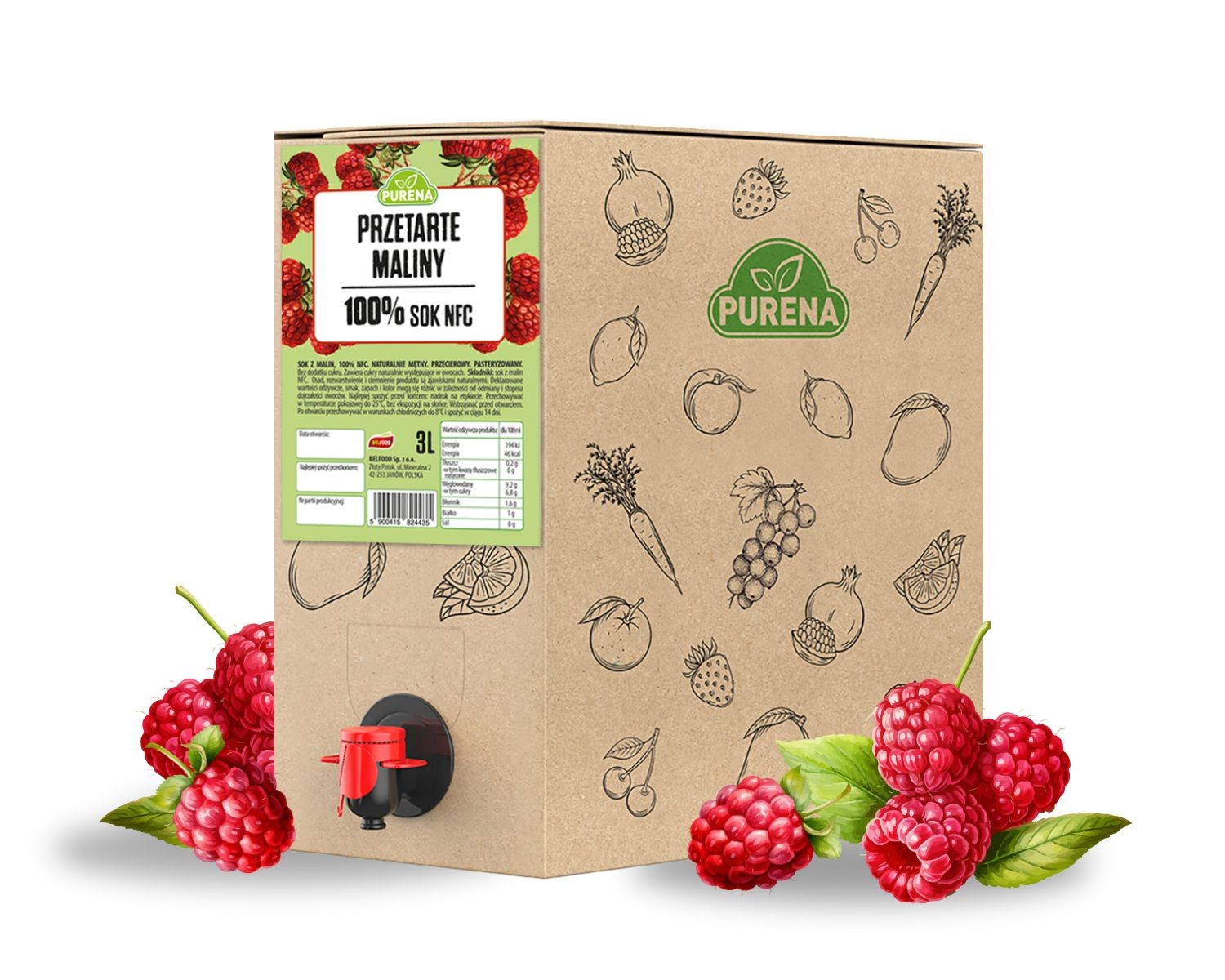 Przedmiotem sprzedaży są Przetarte maliny 100% NFC sok i przecier w jednym PURENA 3l