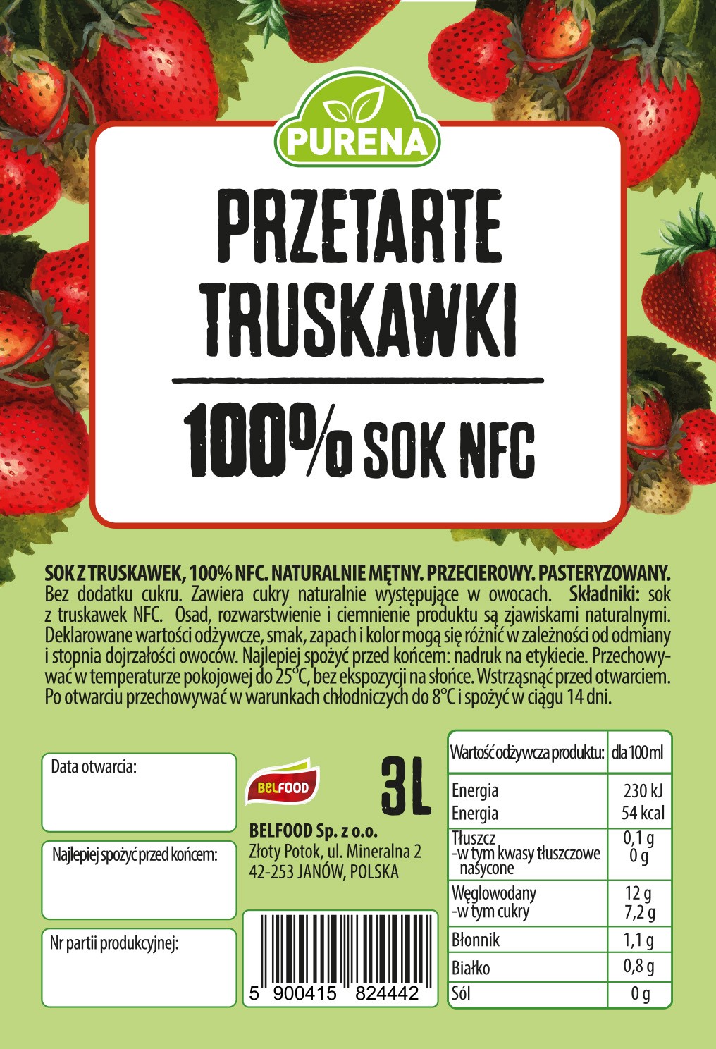 Przedmiotem sprzedaży są Przetarte truskawki 100% NFC sok i przecier w jednym PURENA 3l