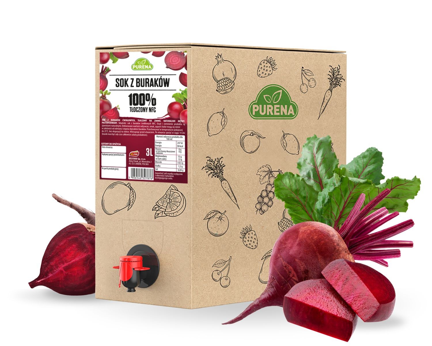 Naturalny sok z buraków 100% tłoczony na zimno NFC PURENA 3 L