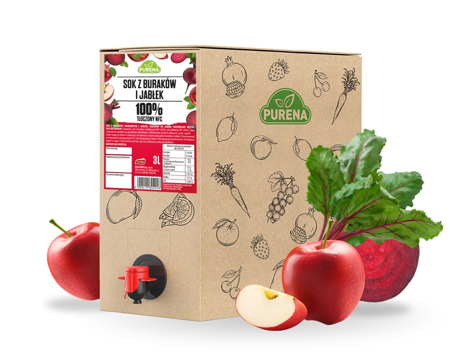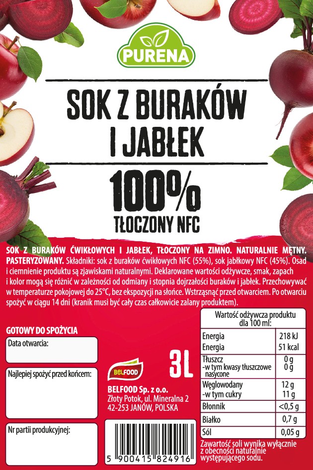 Orzeźwiający sok z buraków i jabłek 100% tłoczony na zimno NFC PURENA 3 L