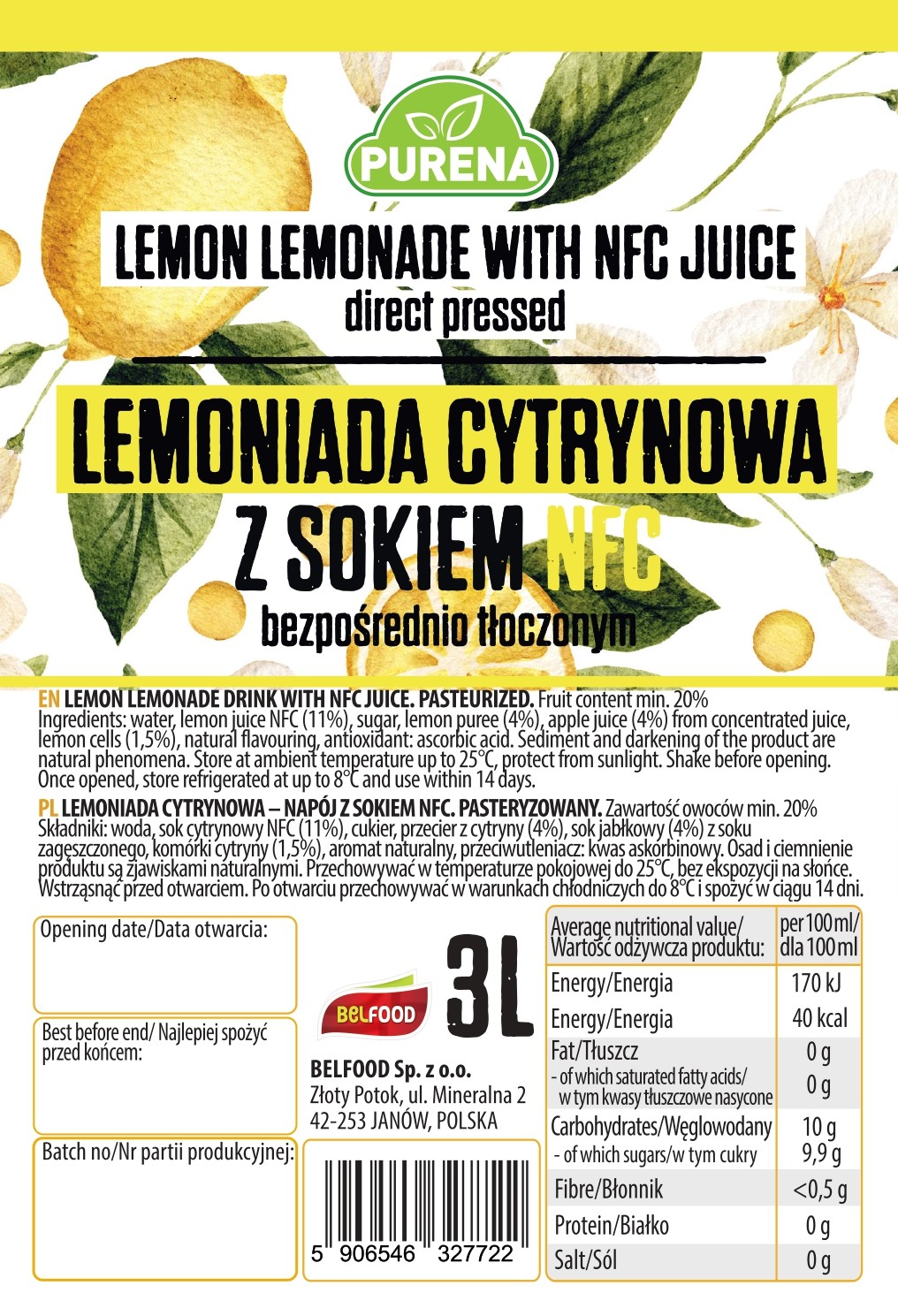 Lemoniada cytrynowa z sokiem NFC bezpośrednio tłoczonym PURENA 3 L x 3 sztuki