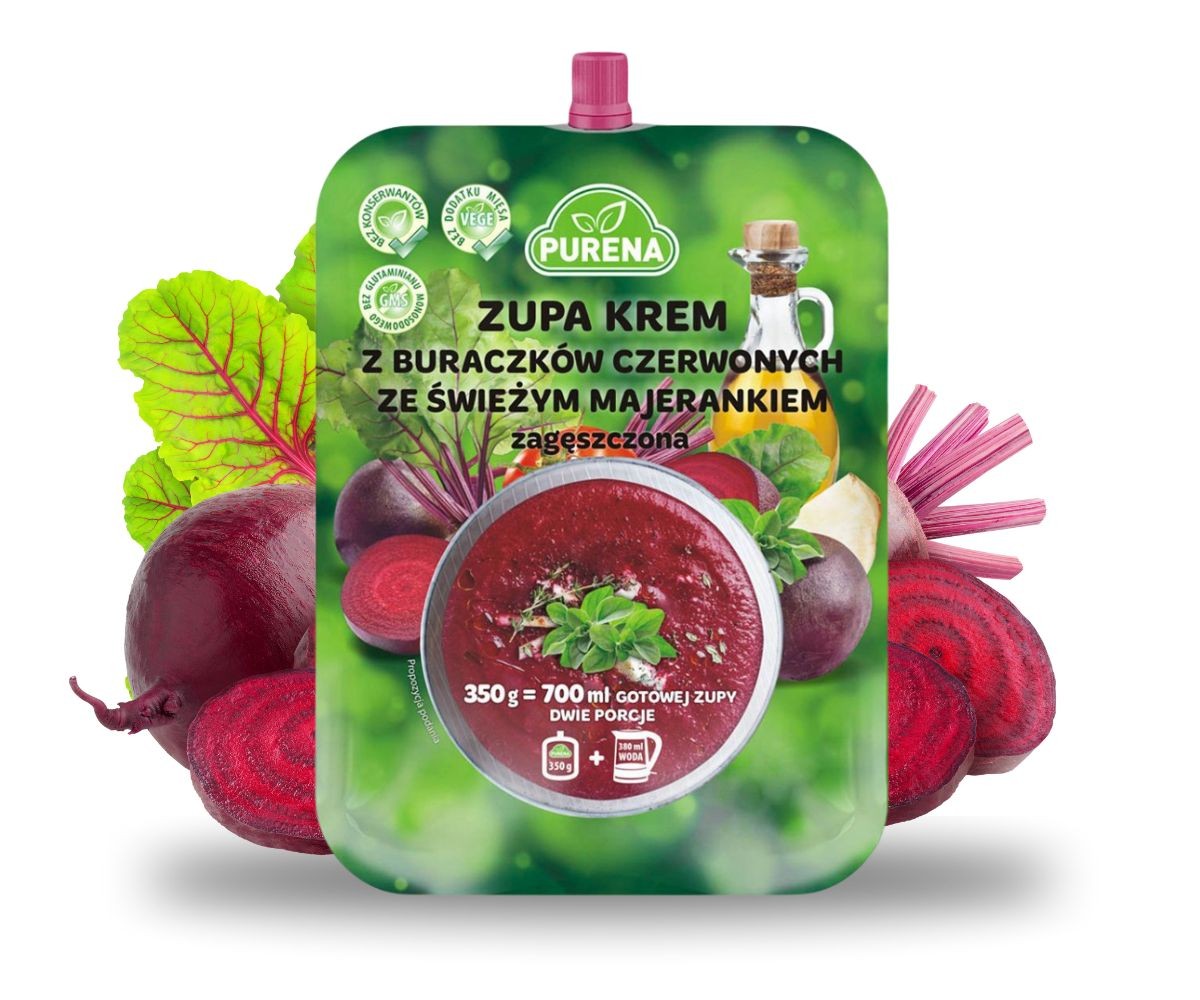 – ZUPA KREM - 1 saszetka zupy krem z buraczków czerwonych+380 ml gorącej wody. Podawać z grzankami lub groszkiem ptysiowym.